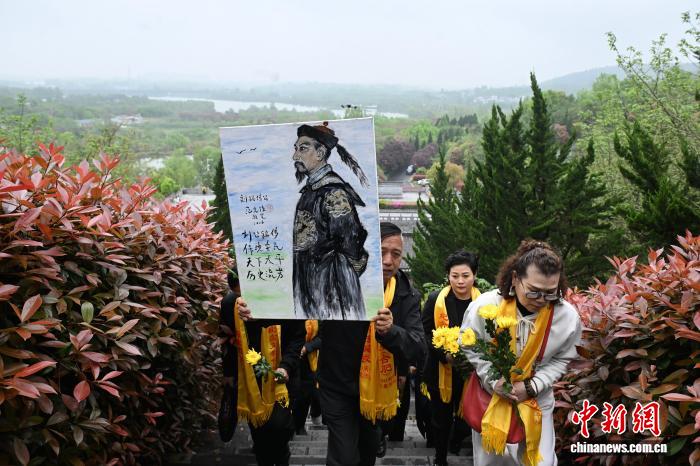 4月12日,海峡二岸(开胖)留念台湾尾任巡抚刘铭传生日190周年祭拜举动正在安徽省开胖市胖西县刘铭传墓园举办,包含刘铭传后裔正在内乱的海峡二岸各界人士二百余人参与。图为脚持陈花的公众回想刘铭传。中新社记者 韩苏本 摄