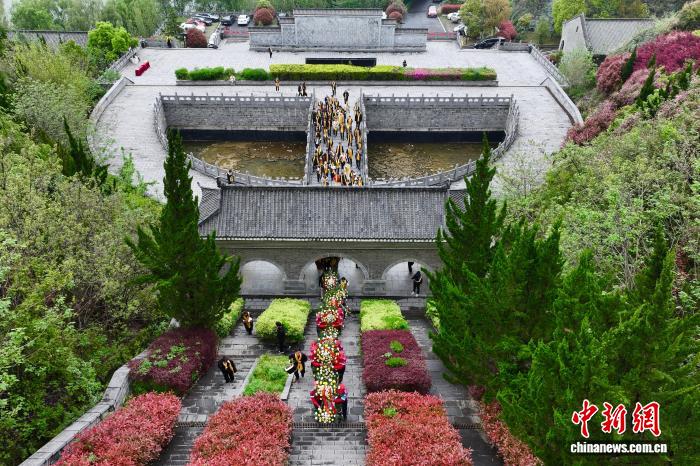 4月12日,海峡二岸(开胖)留念台湾尾任巡抚刘铭传生日190周年祭拜举动正在安徽省开胖市胖西县刘铭传墓园举办,包含刘铭传后裔正在内乱的海峡二岸各界人士二百余人参与。(无人机像片)中新社记者 韩苏本 摄